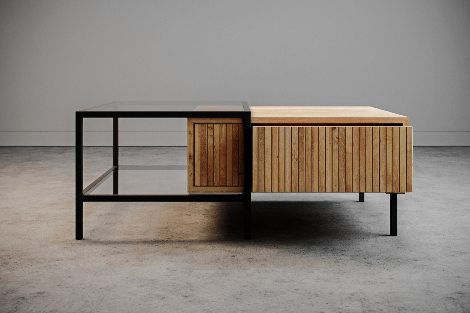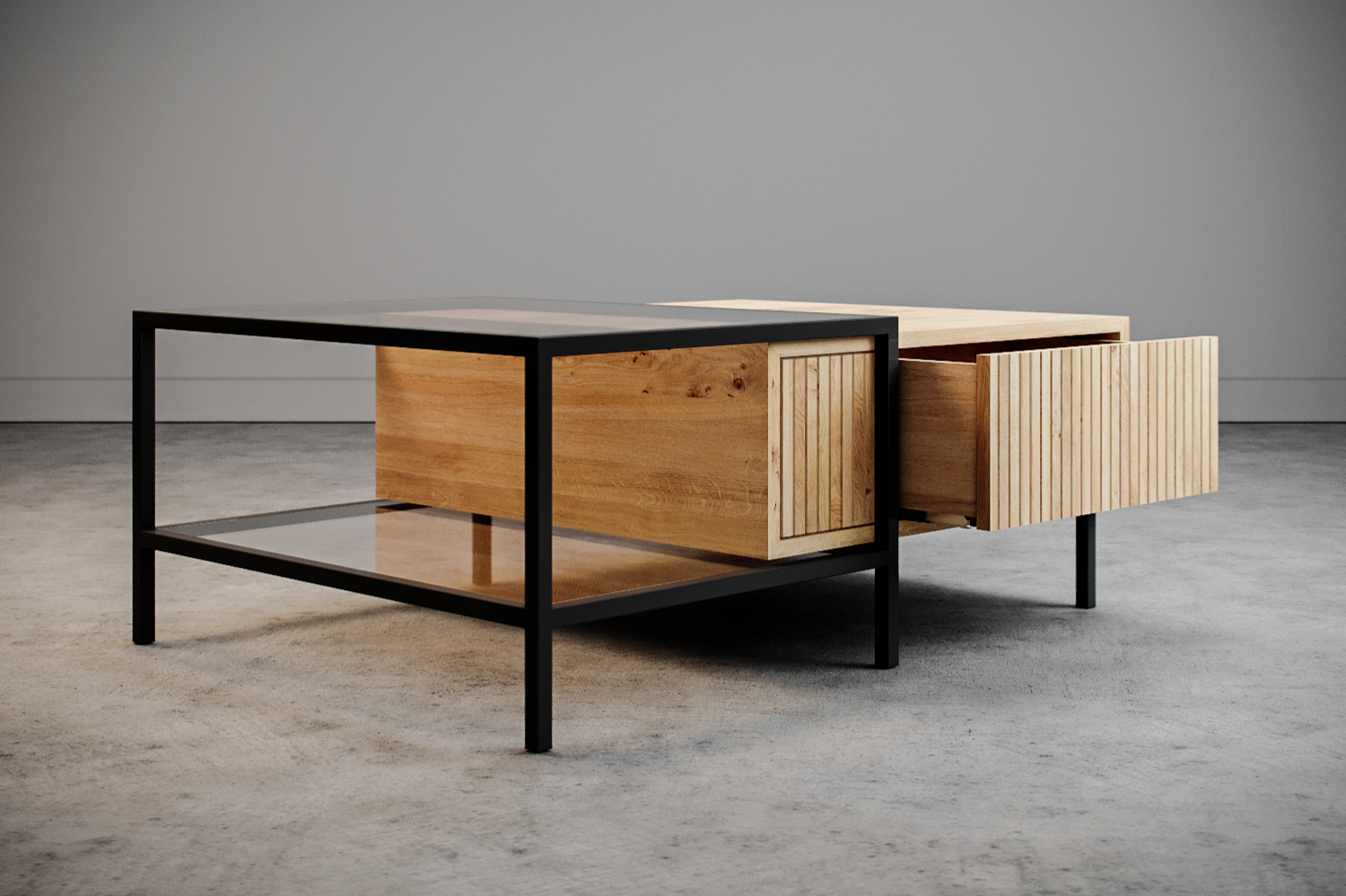 Podstawa stolika wykonana jest z twardej i odpornej na wszelkie uszkodzenia stali pomalowanej metodą proszkową o profilu 2x2cm. Z kolei druga część stolika to przestrzenna bryła z ukrytym schowkiem, w którym sprytnie ukryjesz wszystkie niezbędne przedmioty.